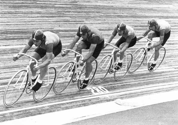 It quickly became apparent that the teams from East and West Germany and Russia were the likely medallists. East Germany had the streamlined machines and the carefully matched riders; West Germany had the silky appearance and the iron discipline; and Russia had the marvellous technique, especially at starting where their riders dropped into an unusual formation but were always the first team to settle. It was noticeable, too, that where all other teams carried out their changes by having the leader go up the banking in a graceful arc, Russian riders went up in a fairly straight line, turned sharply and rocketed back down.