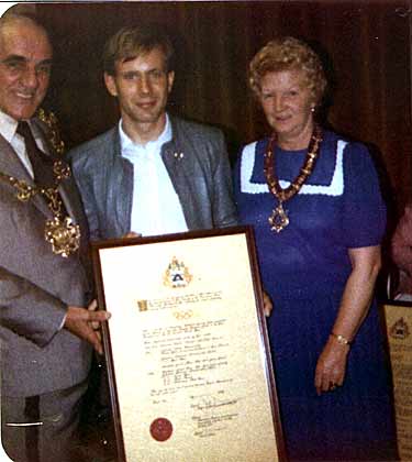 Swimmers Samantha Purvis, 17, and Stuart Wilmot, 20, and cyclist Paul Curran, 23, were presented with framed scrolls to mark their achievements by the Mayor of Stockton, Councillor Jack Munsey.