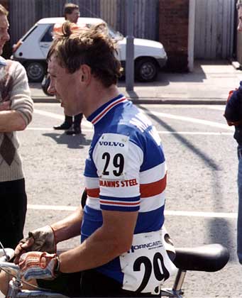 On the second approach to Ormesby Bank Curran attacked, taking with him Martin Young (Chesterfield Coureurs) and Terry Morgan (VC Olympia). At the top of the climb the trio led the bunch by 15 seconds, but Curran's furious pace soon dropped Morgan, and when Young also fell away just outside Skelton Curran continued alone, still 45 seconds behind the leading break.
